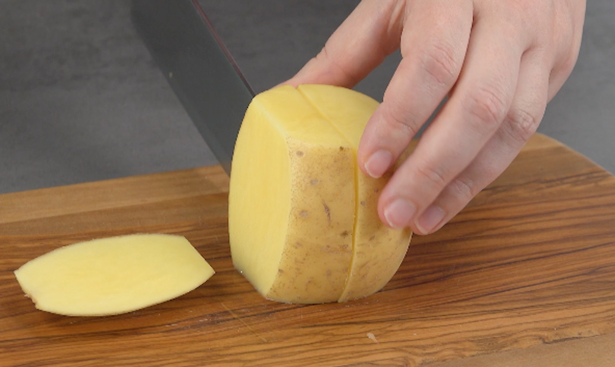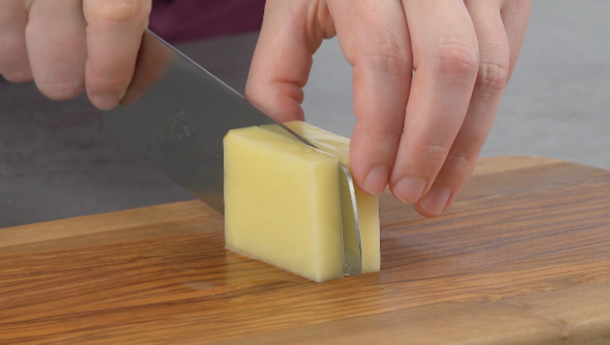 1.2 Schneide die rechteckigen Kartoffeln in je zwei etwa 1 cm dicke Scheiben.
