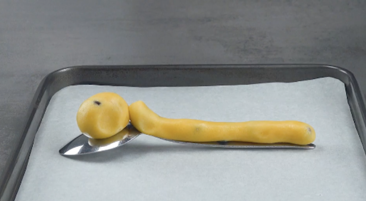 3.3 Lege einen weiteren (eingefetteten) Löffel auf den Teig und drücke beide Löffel zusammen, sodass dazwischen ein Löffel aus Cookie-Teig entsteht. Hilf an den Rändern mit deinen Fingern nach.