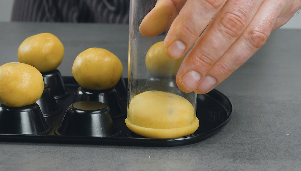 1.2 Lege auf jedes Mulden-„Podest“ eine Teigkugel. Drücke sie mit dem Boden eines Glases zuerst platt. Dann drehst du das Glas um und drückst den Teig mit dem Glasrand etwas herunter. So entstehen kleine Schalen. Lasse sie gut durchkühlen und gib sie bei 180 °C Ober- und Unterhitze für 30 Minuten in den Ofen. Wenn du die Form aus dem Ofen holst, löse die kleinen Cookie-Schalen sofort von der Form.