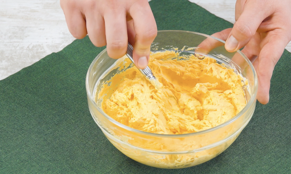 1.2 Gib Frischkäse, Mayo, Salz und Pfeffer zu den Eigelben und vermenge alles zu einer Creme.