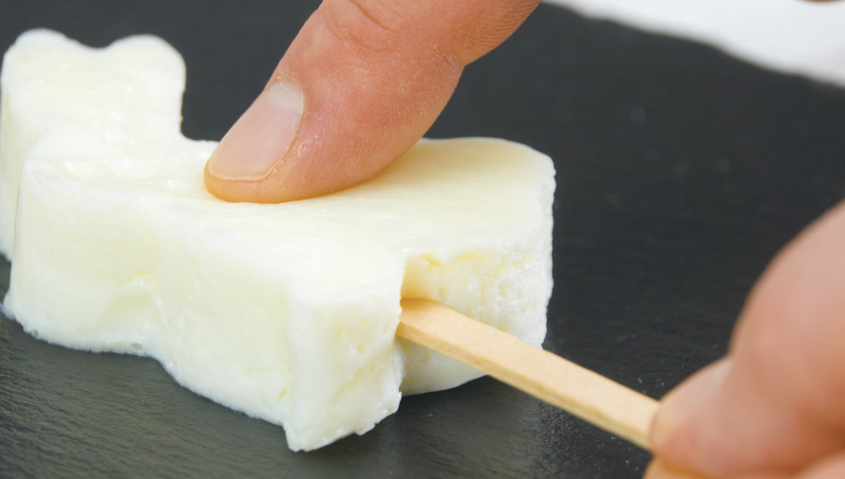 2.4 Stich mit den Oster-Ausstechformen vorsichtig die Formen aus dem Eiweiß und lege sie dann auf einen Teller. Stecke in die ausgestochenen Eiweiß-Formen vorsichtig jeweils einen Eisstiel.