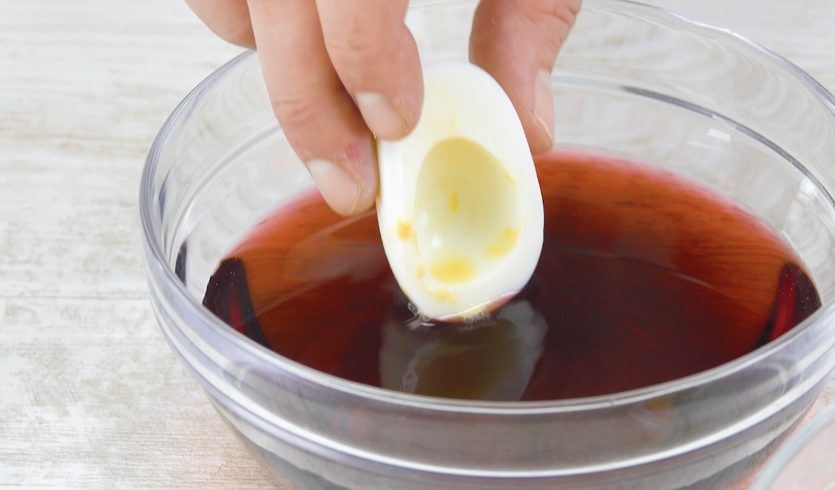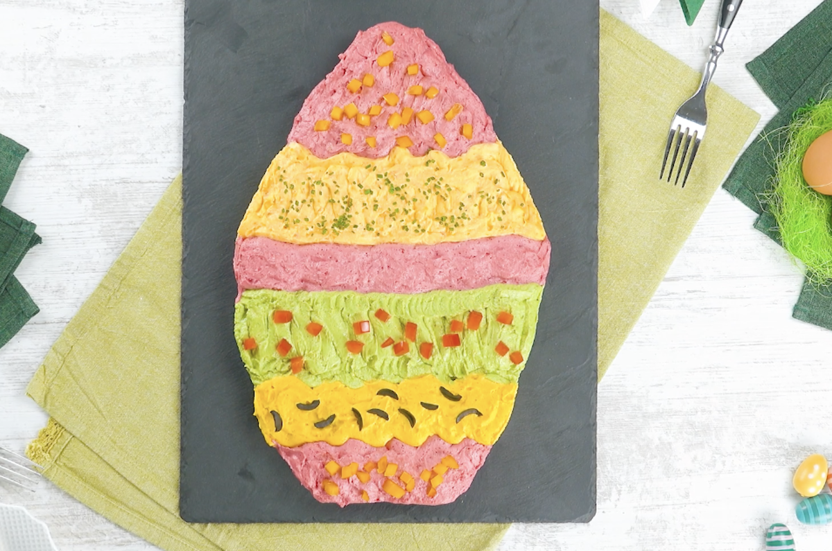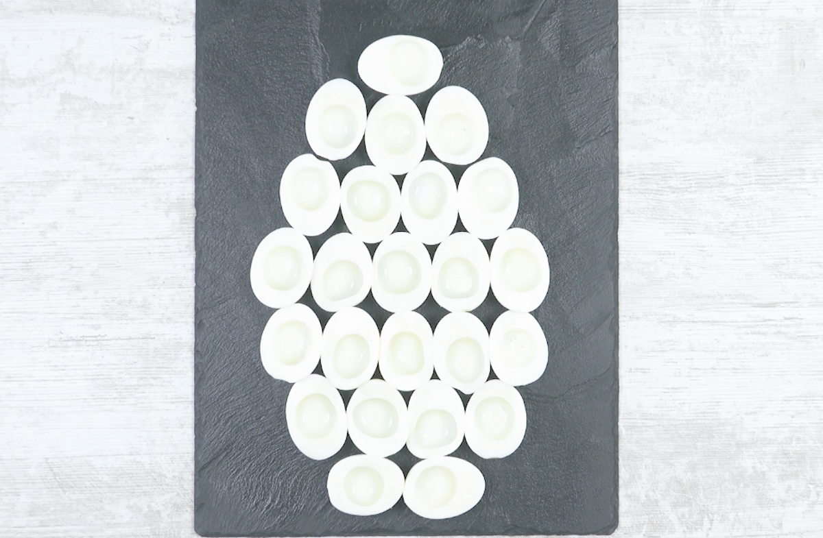 1.1 Halbiere die gekochten Eier und gib die Eigelbe in eine Schüssel. Drapiere die halben Eier in Form eines großen Eis auf einer Platte.