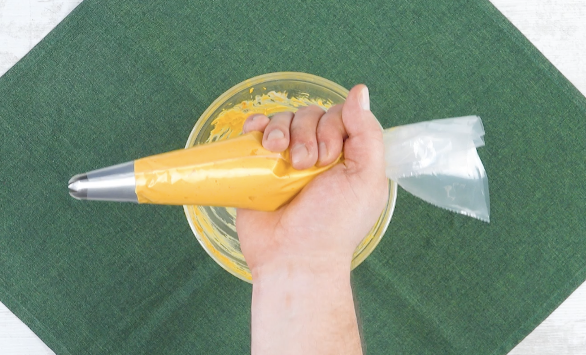 2.5 Verziere die Eiweiße am Stiel mit der Creme aus dem Spritzbeutel.