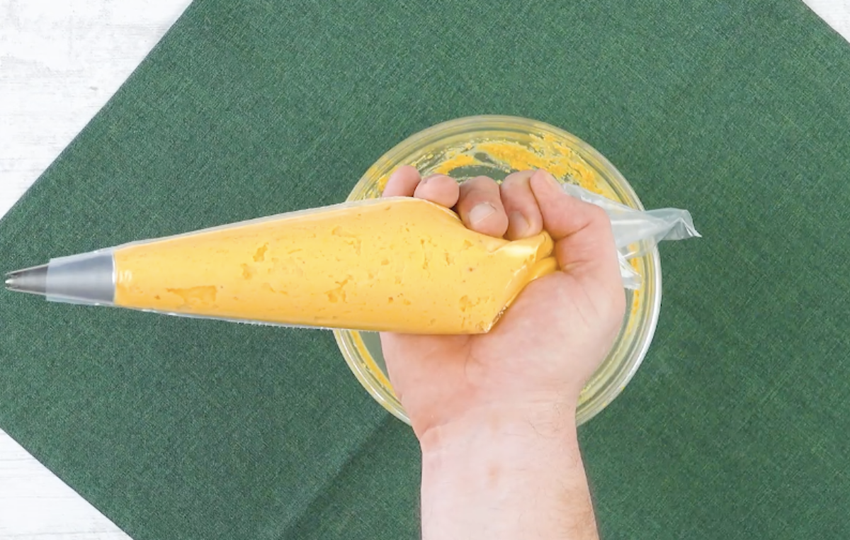 3.2 Die Eigelbe vermischst du am nächsten Tag mit Mayonnaise, Chilisauce, Salz und Pfeffer und füllst sie in einen Spritzbeutel.