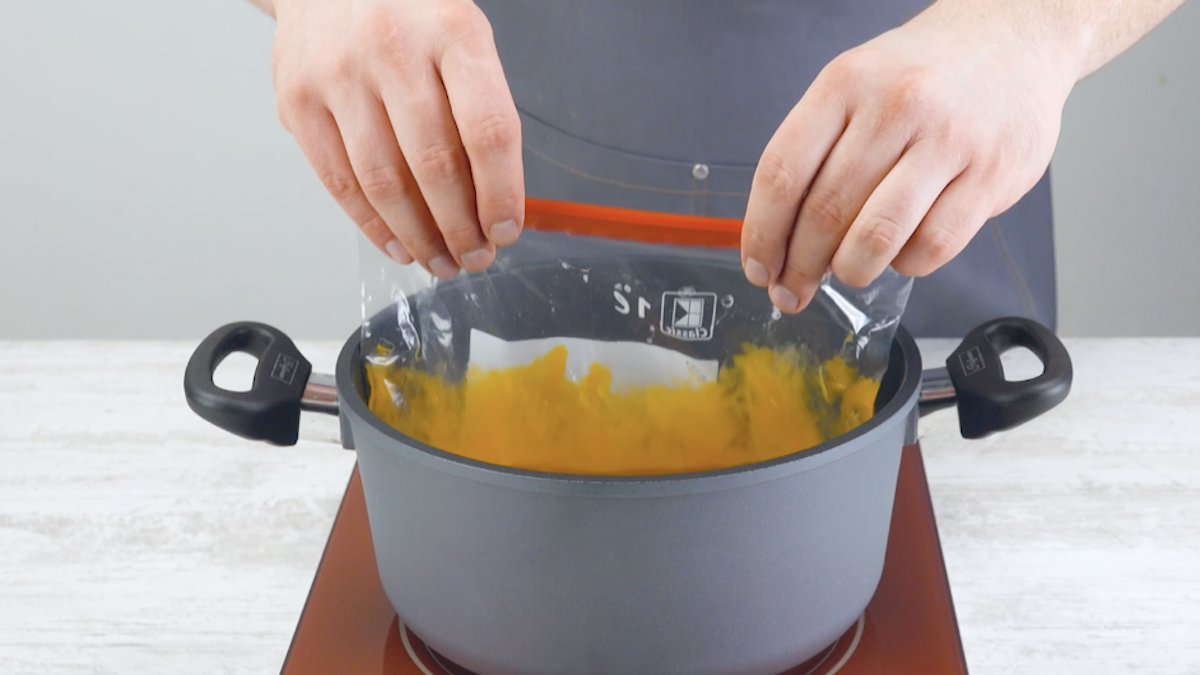 2.2 Gib die Eigelbe in einen Zip-Beutel und lasse sie in einem Wasserbad ca. 10 Minuten garen. Danach lässt du sie ebenfalls komplett abkühlen.