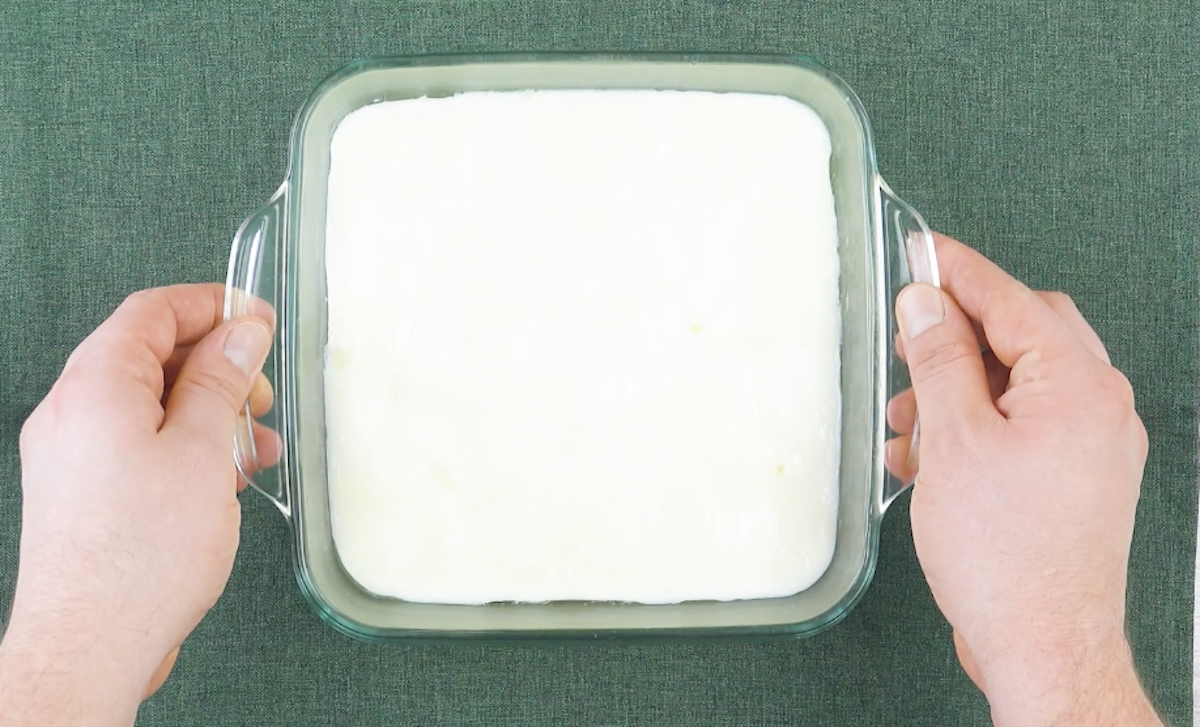 2.1 Trenne die Eier und schlage beide Teile jeweils vorsichtig mit einem Schneebesen. Gib das Eiweiß in eine Glasform und stelle diese in eine tiefe Backform. Gieße heißes Wasser in die Backform und decke das Eiweiß in der Glasform mit Alufolie ab. Stelle alles bei 140 °C Umluft für 35 Minuten in den vorgeheizten Backofen. Lasse das Eiweiß danach im Kühlschrank komplett abkühlen.