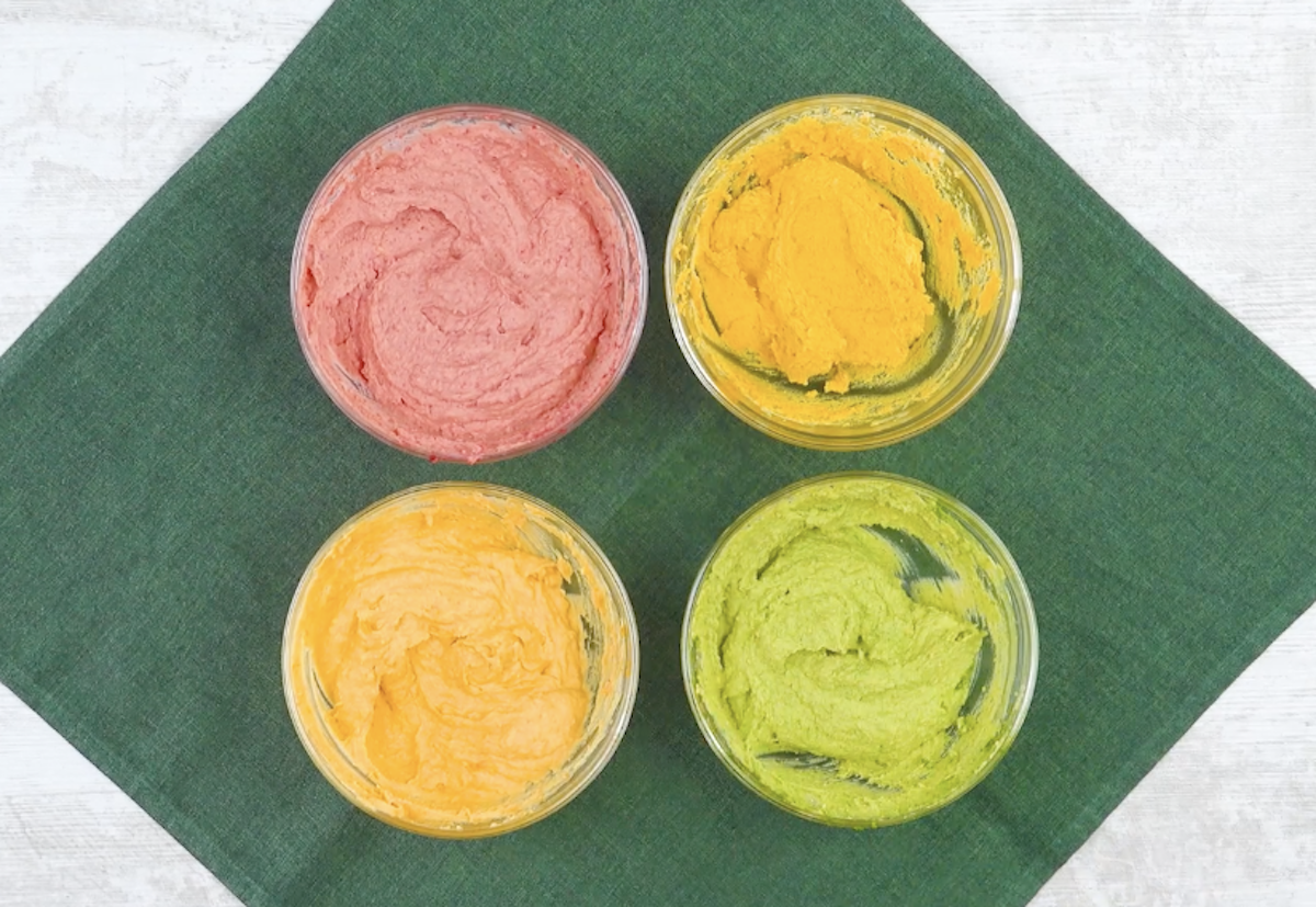 1.4 In die Schüssel mit den 40 % Creme gibst du das Rote-Bete-Püree hinzu. Die anderen 3 Schüsseln bekommen Kurkuma, Karottenpüree und Spinat beigemischt.