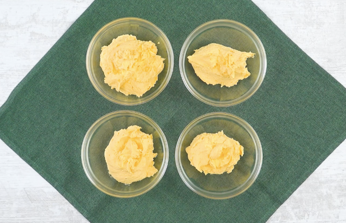 1.3 Teile die Masse in folgendem Verhältnis auf 4 Schüsseln auf: ca. 40, 20, 20 und 20 %.