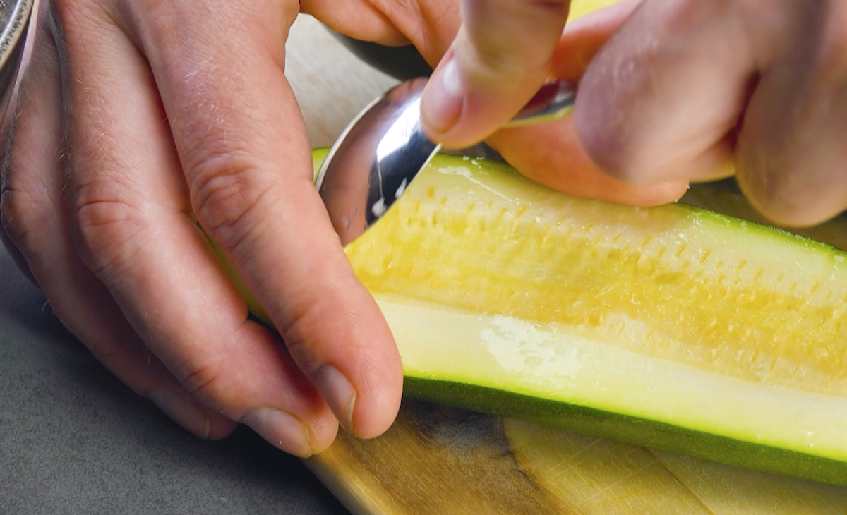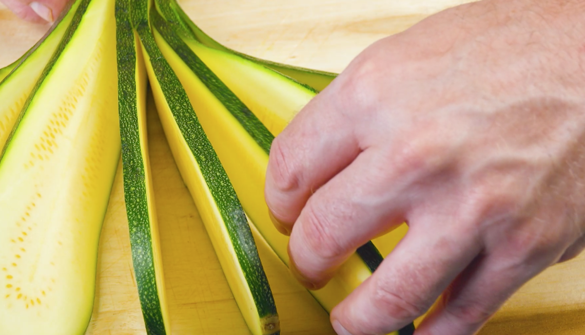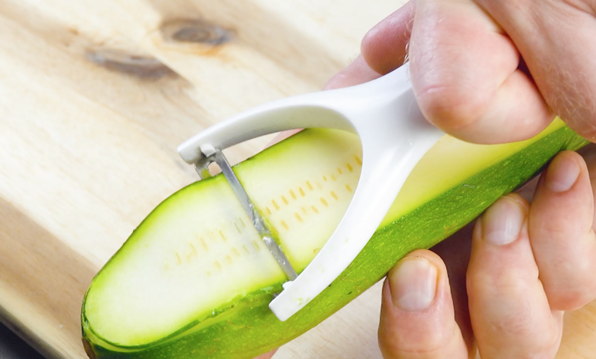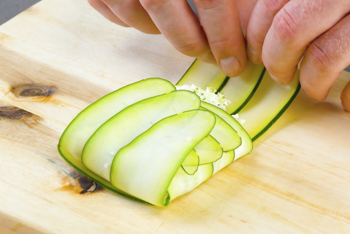 2.1 Schneide die Zucchini mit einem Sparschäler längs in dünne Scheiben.