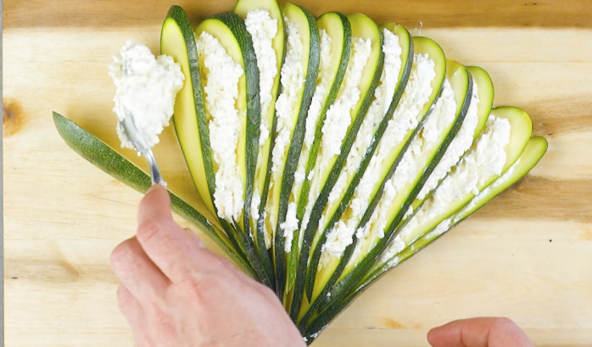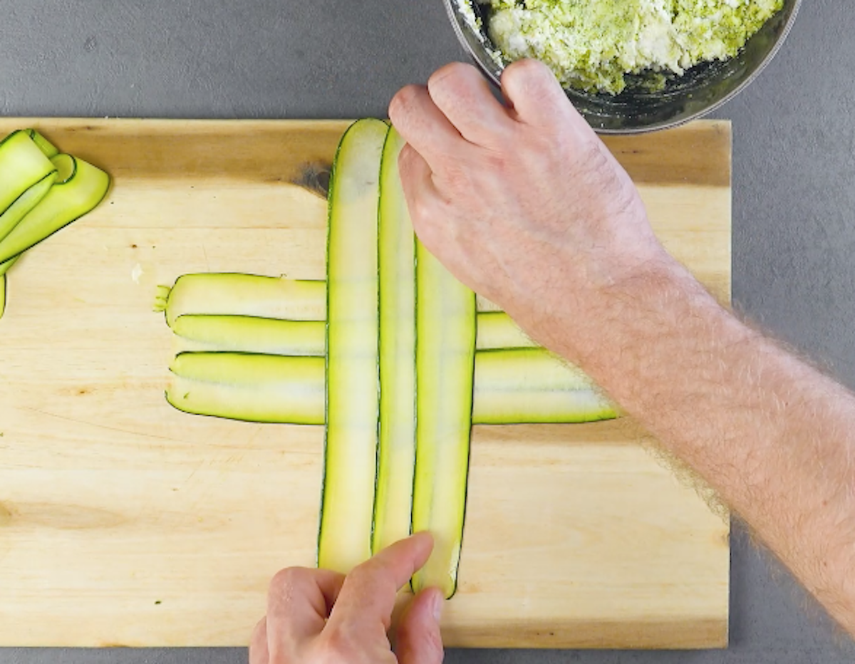 2.4 Gib nun einen Löffel von der Käsemischung in die Mitte des Zucchini-Kreuzes und „packe“ das Zucchini-Päckchen ein.