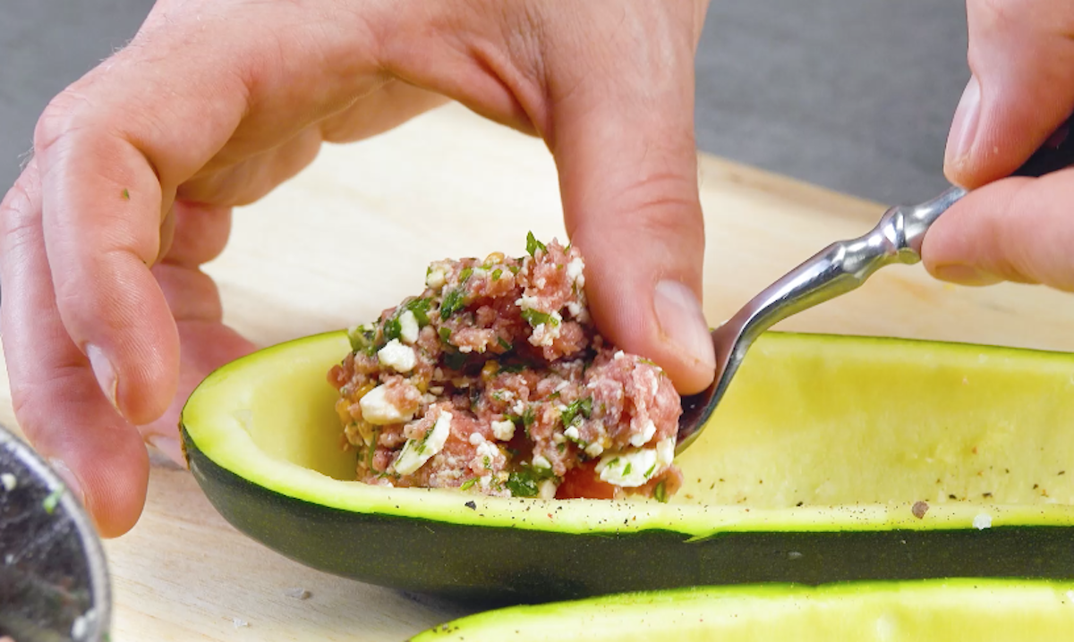 3.2 Vermische Hackfleisch mit kleingeschnitten Kirschtomaten, Feta, Petersilie, Olivenöl, Salz und Pfeffer und fülle damit die Zucchini-Hälften.