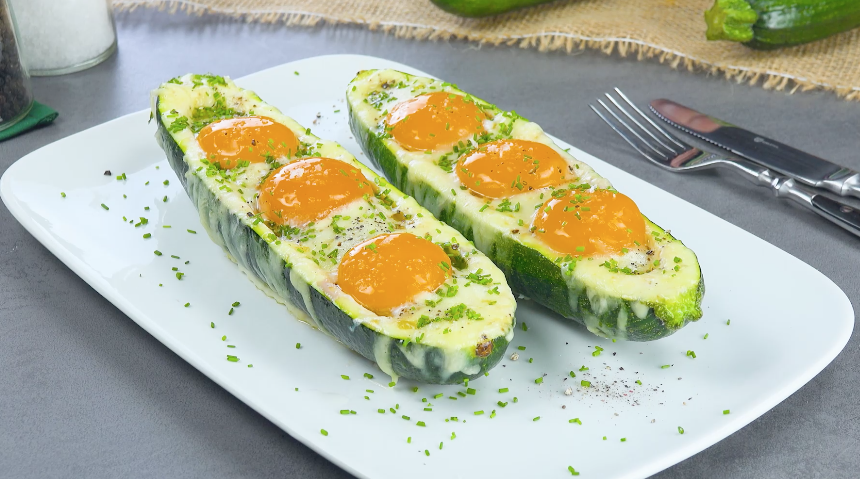 3.3 Setze jeweils 3 Eier auf die Hack-Mischung in den Zucchini-Hälften. Verteile über allem noch geriebenen Käse und schiebe die gefüllten Hälften bei 140 °C Umluft für 35 Minuten in den Ofen.