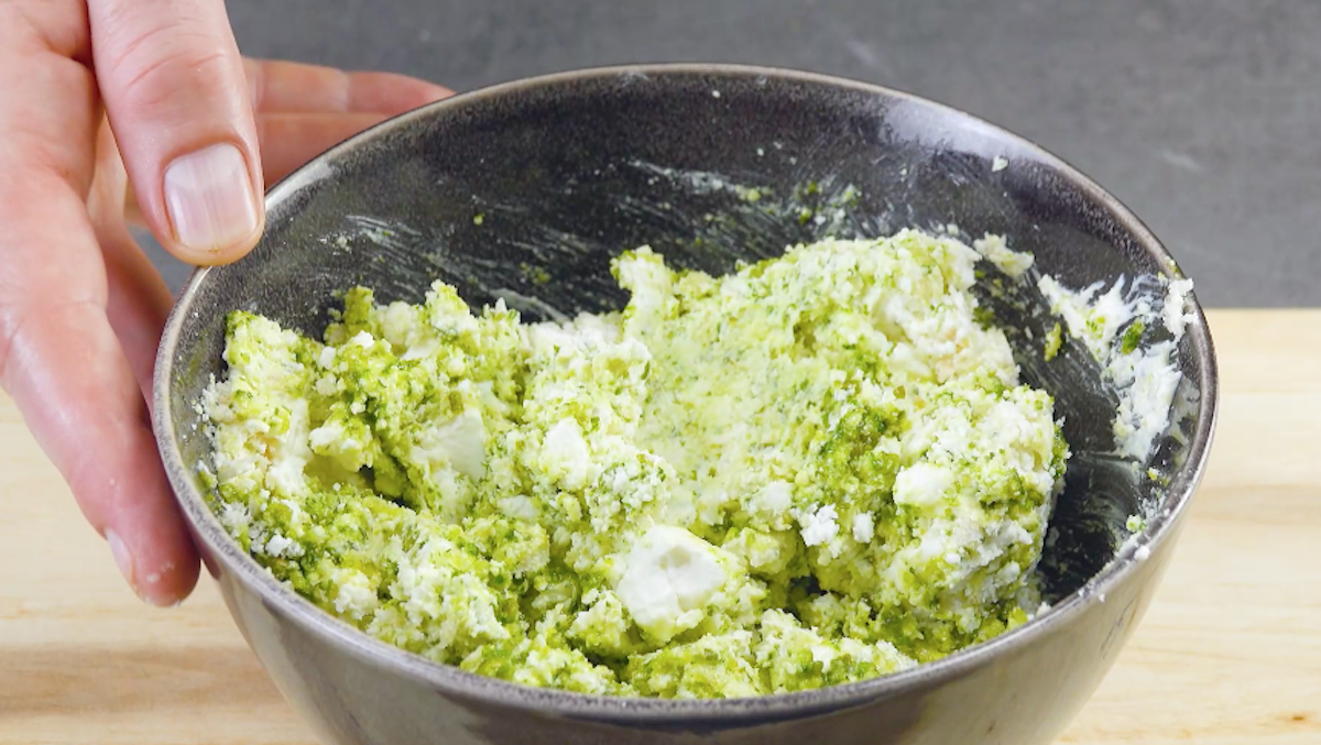 2.2 Vermische Frischkäse mit zerkrümeltem Feta, Paniermehl, Pesto, Salz und Pfeffer.