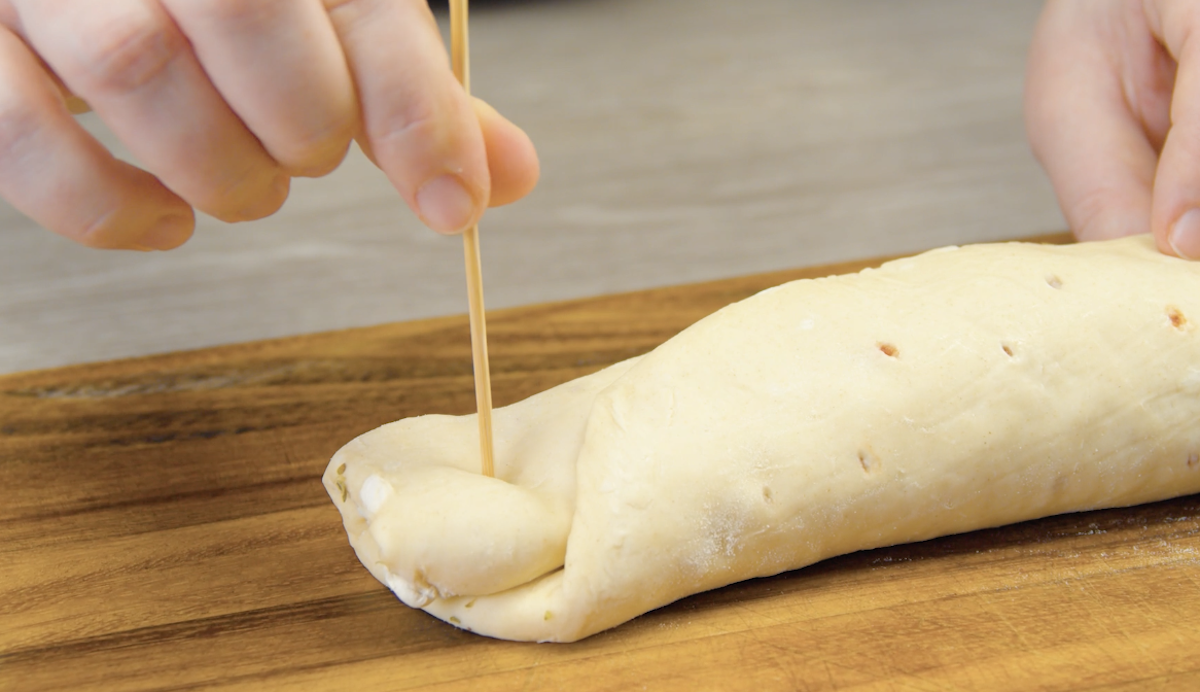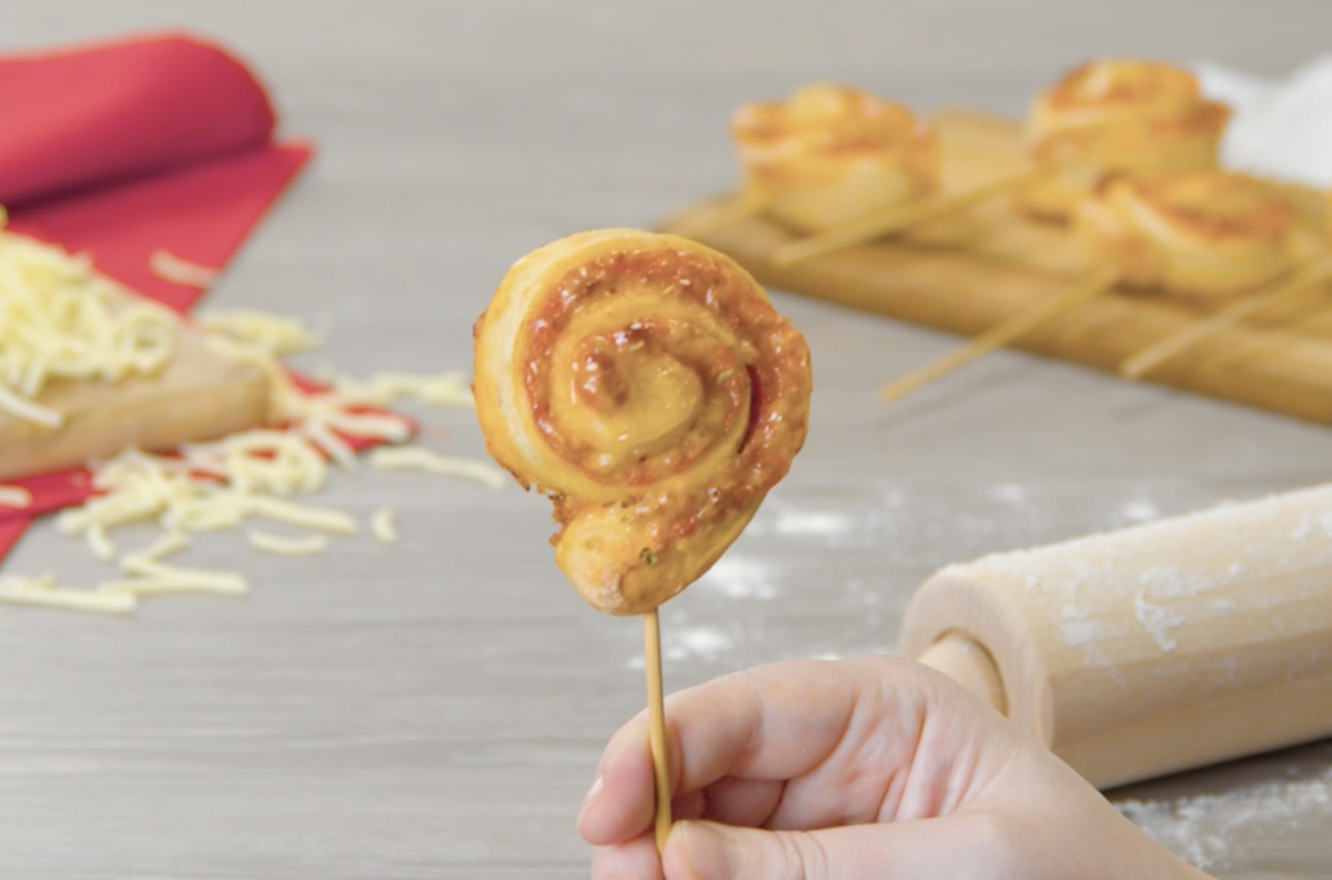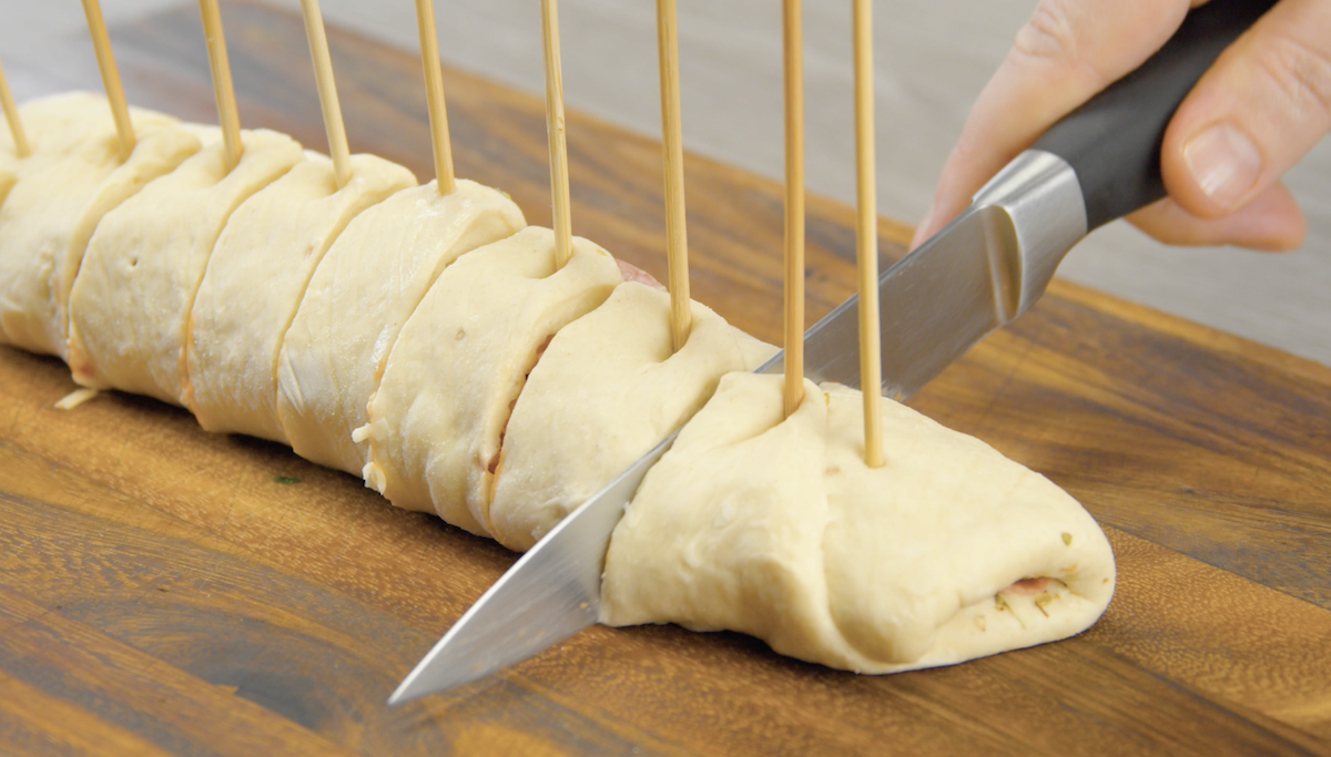 1.2 Schneide die Pizzarolle zwischen den einzelnen Spießen durch, sodass 9 Pizzaschnecken am Spieß entstehen.
