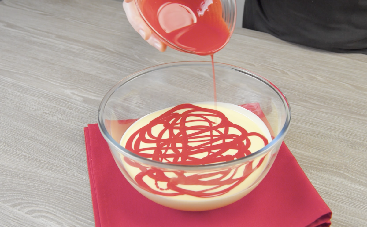 3.2 Temperiere weiße Schokolade und färbe 1/4 davon mit fettlöslicher, roter Lebensmittelfarbe ein. Gib ein bisschen von der rot eingefärbten Schokolade über die weiße Kuvertüre.