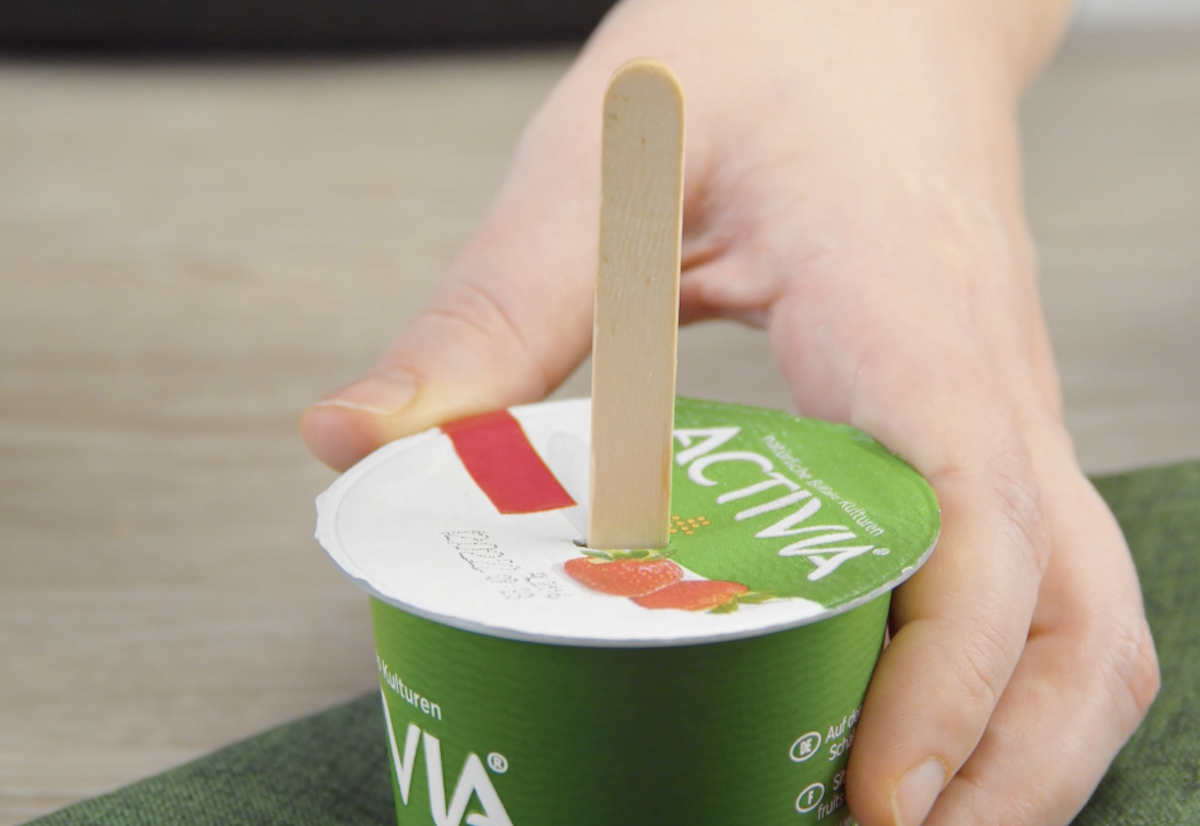 3.1 Stecke in jeden Joghurtbecher einen Eisstiel und stelle die Joghurts dann für 6 Stunden in den Gefrierschrank.
