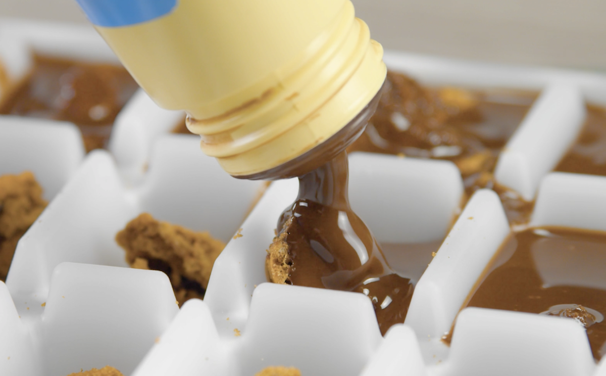 2.1 Zerkrümele die Cookies grob in die Mulden der Eiswürfelform und fülle diese mit Schokosauce auf.