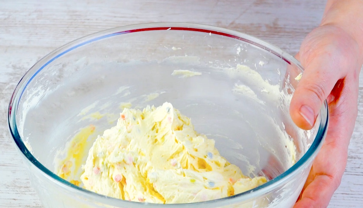 2.4 Schlage für die Buttercreme zunächst die weiche Butter schaumig. Rühre dann die Kondensmilch ein und hebe zum Schluss das Zuckerkonfetti unter.