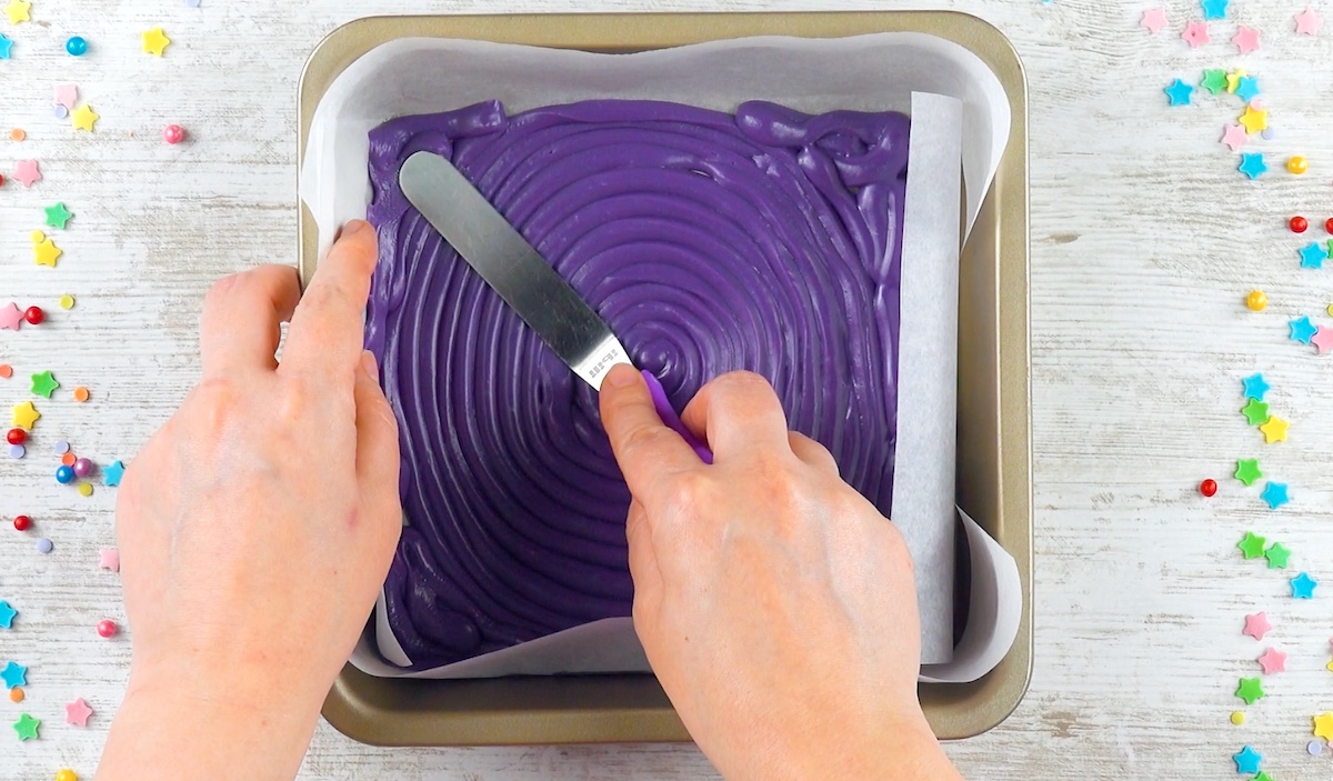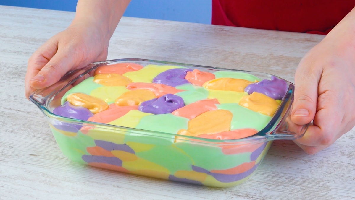 3.3 Lege die Innenseiten der Kuchenform mit Backpapier aus. Fülle die bunten Massen nun nacheinander in die Form. Wir empfehlen, die Massen spiralförmig in die Form zu geben und dann glatt zu streichen, bevor die nächste Masse kommt. Mit dieser Technik wird jede Schicht ungefähr gleich dick und das Vermischen der Massen wird vermieden.