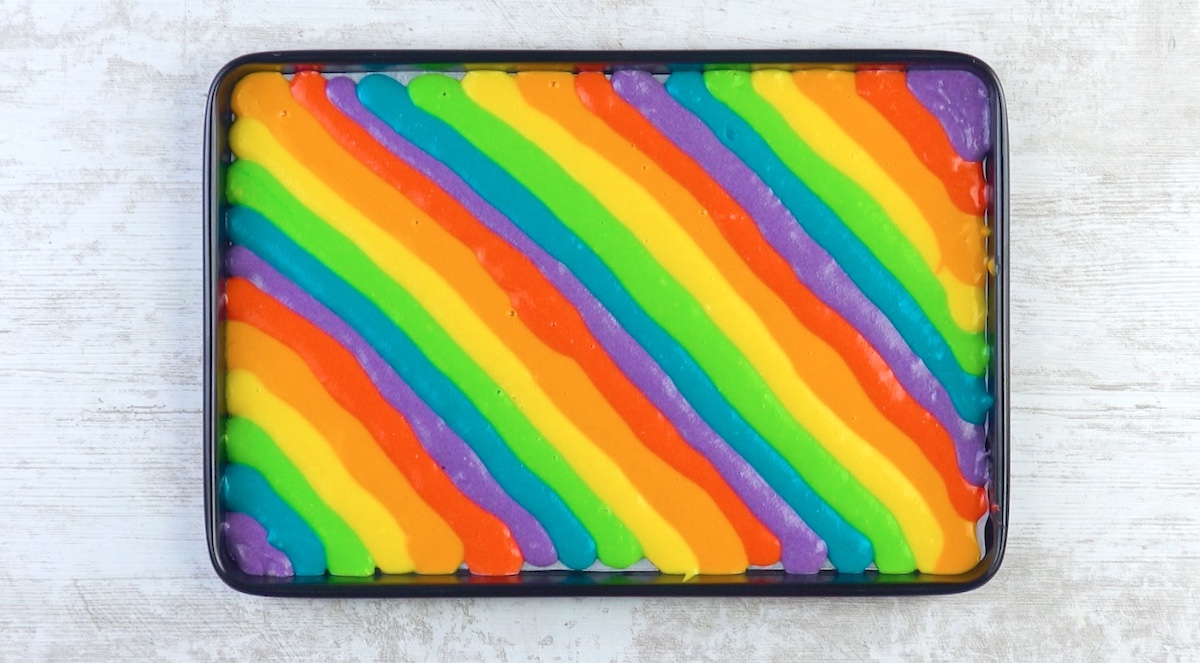 2.2 Lege ein Backblech mit Backpapier aus. Schneide je eine untere Ecke der Zip-Beutel ab und gib die bunten Teige abwechselnd in farbigen Streifen auf das Blech. Backe den Regenbogen-Biskuit dann für 15 Minuten bei 160 °C Umluft.