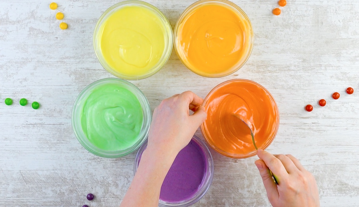3.2 Teile die Masse gleichmäßig auf 6 Schüsseln auf und färbe jede Masse unterschiedlich ein. Fülle die gefärbten Massen dann in je einen wiederverschließbaren Beutel. Schneide dann bei jedem Beutel eine der unteren Ecken ab.