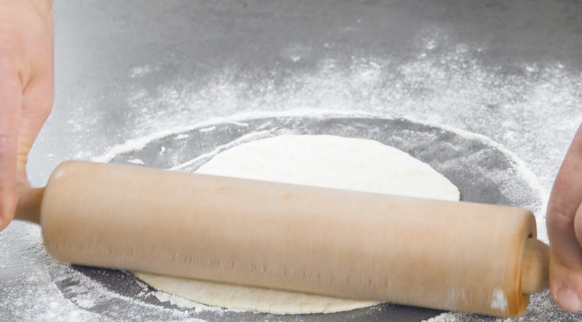 3. Bestreue die Arbeitsfläche mit Mehl und rolle die Teigkugeln einzeln zu flachen Fladen aus.