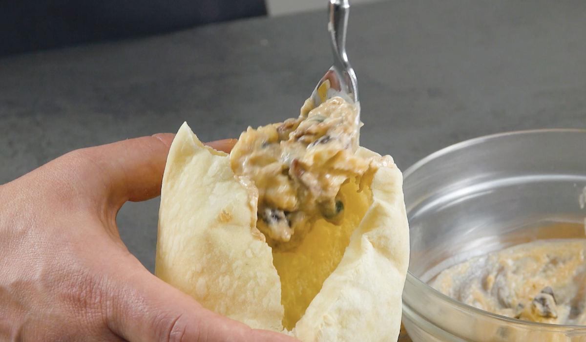 5. Kommen wir nun zu den drei verschiedenen Füllungen. Für Füllung 1 gibst du Eier mit Lauchzwiebeln, Tomaten und Käse in eine Schüssel und vermengst alles miteinander. Fülle die Rührei-Mischung in drei der Fladen. Lege die gefüllten Fladen vorsichtig in eine heiße Crêpepfanne und backe sie von beiden Seiten 3 bis 4 Minuten bis sie goldbraun sind.