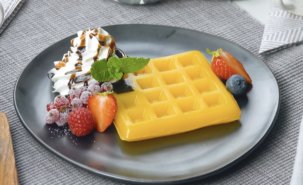 3.2 Entferne die Waffelbleche vom Waffeleisen und lege sie vor dich auf die Arbeitsfläche. Befülle beide Waffelbleche mit der orangefarbenen Flüssigkeit und stelle sie dann für 4 Stunden in den Kühlschrank.
