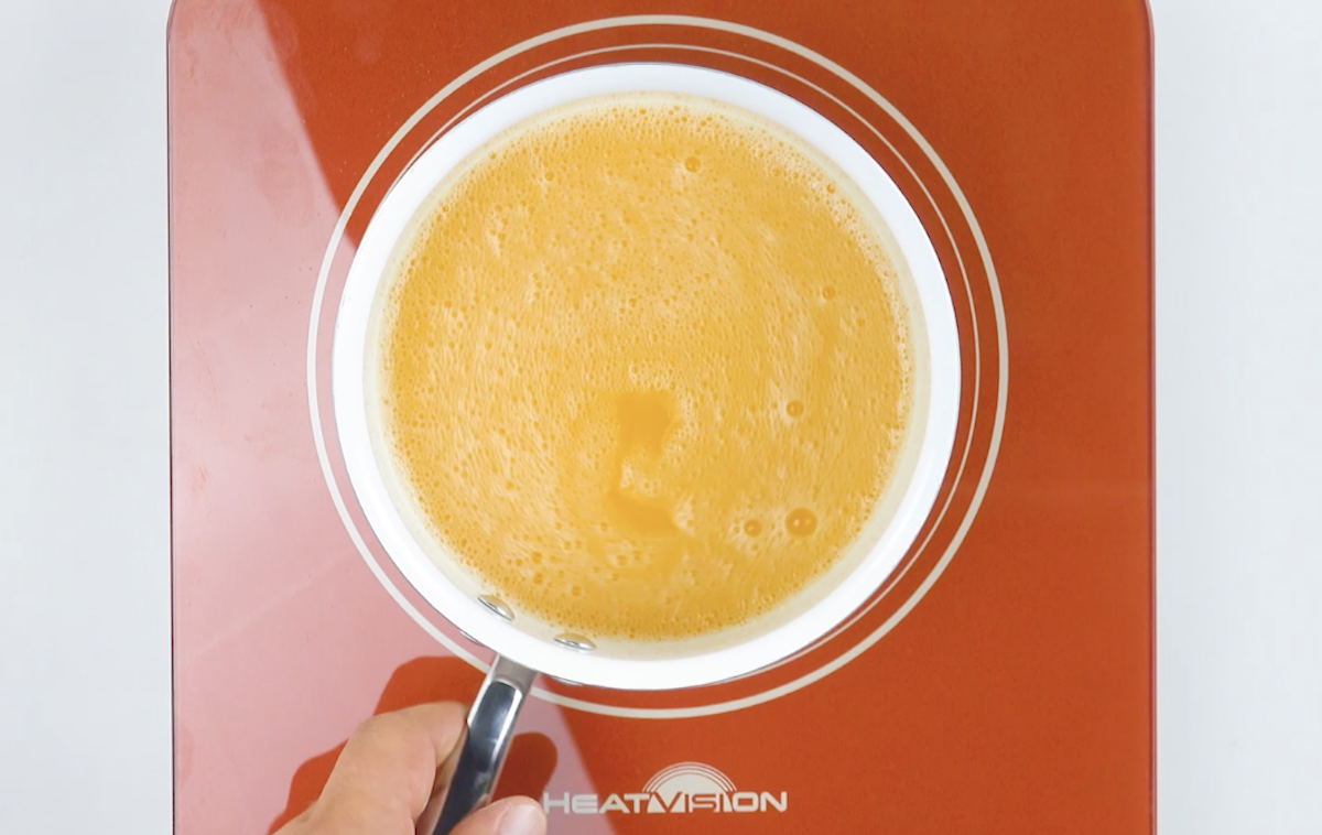 3.1 Gib den Orangensaft mit der Gelatine zusammen in einen Topf und lass sie kurz quellen. Erwärme dann alles langsam.