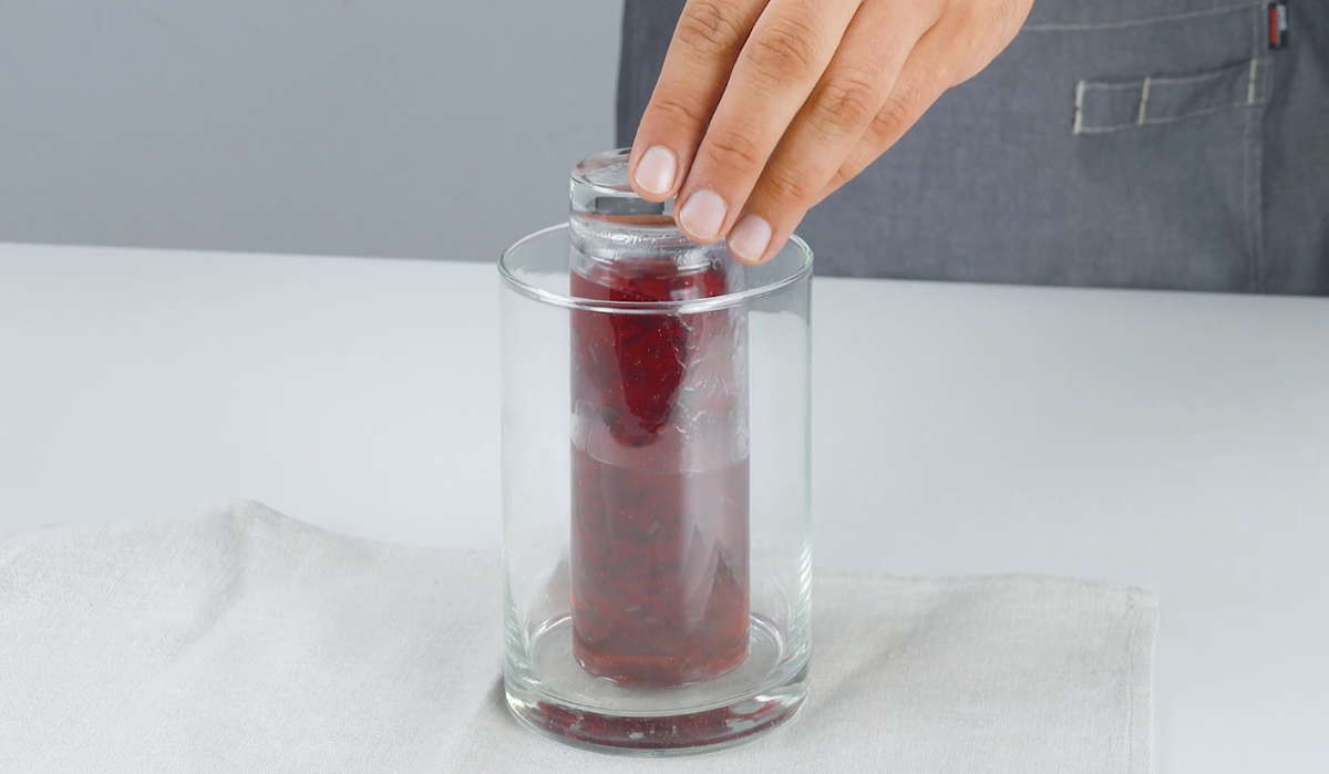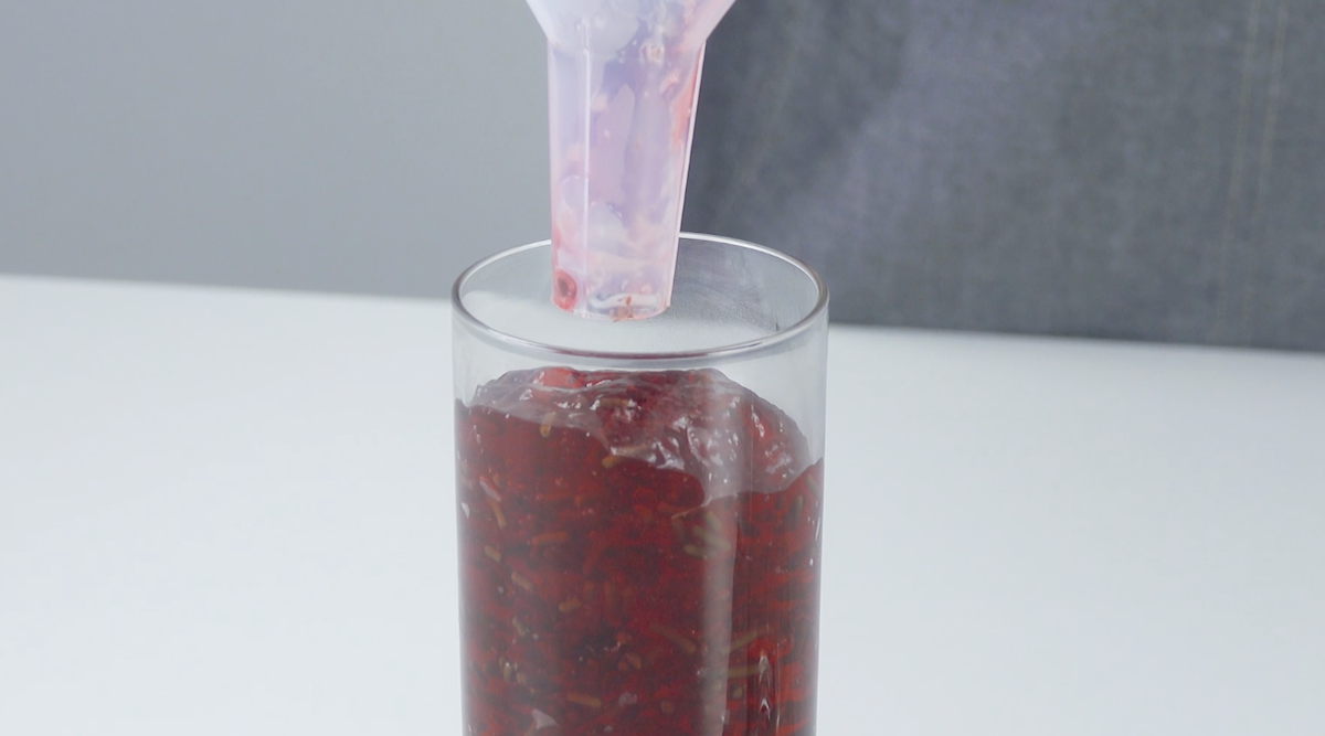 1.2 Fülle die rote Flüssigkeit in eine Schüssel und stelle diese in eine noch größere Schüssel mit Eiswasser. Lass die rote Flüssigkeit unter ständigem Rühren so weit herunterkühlen, bis sie langsam zu gelieren beginnt. Rühre dann noch die Schokostreusel unter. Fülle den Wackelpudding in das kleinere, mit Öl benetzte Glas und lass unbedingt 1 cm Platz bis zum oberen Rand. Stelle das Glas für mindestens 4 Stunden in den Kühlschrank.