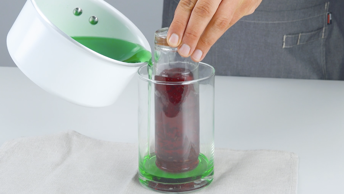 1.4 Fülle die grüne Flüssigkeit nun in das große Glas und ziehe das kleine Glas vorsichtig vom fest gewordenen roten Wackelpudding ab. Lass nun alles nochmals 4 Stunden im Kühlschrank durchkühlen.