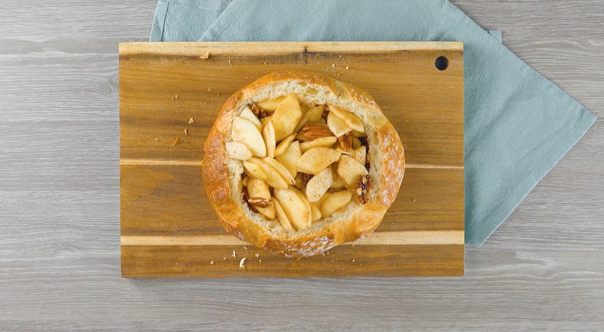2.1 Schneide den Deckel vom Weißbrot ab und höhle es aus. Vermische die Äpfel mit Pekannüssen, Zucker, Zimt und Zitronensaft und fülle die Mischung in das Brot.