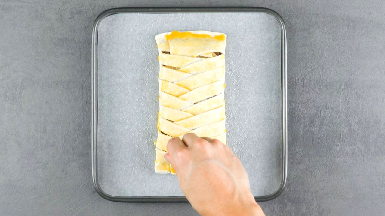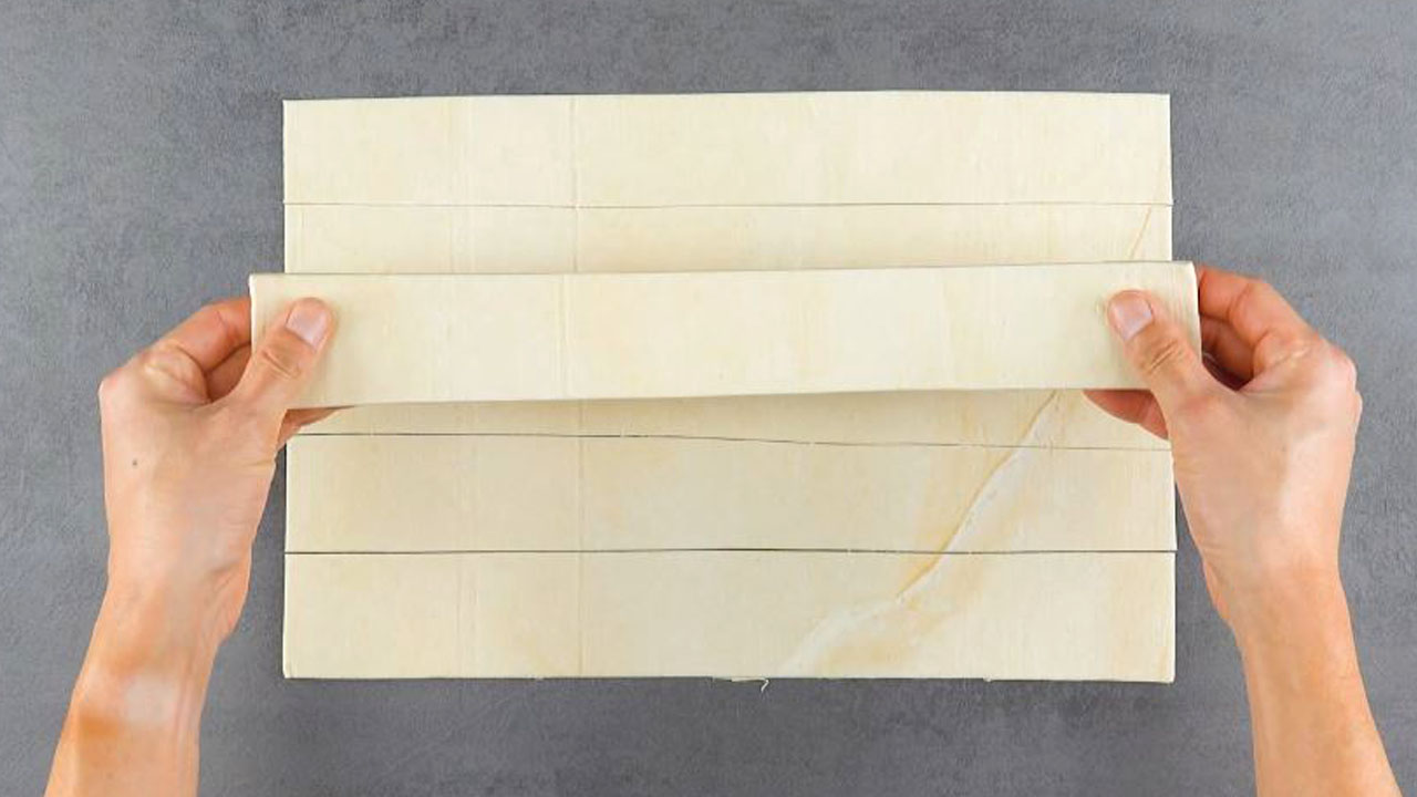 2.1 Breite den Blätterteig quer auf der Arbeitsfläche aus und schneide ihn in 5 cm breite Streifen.