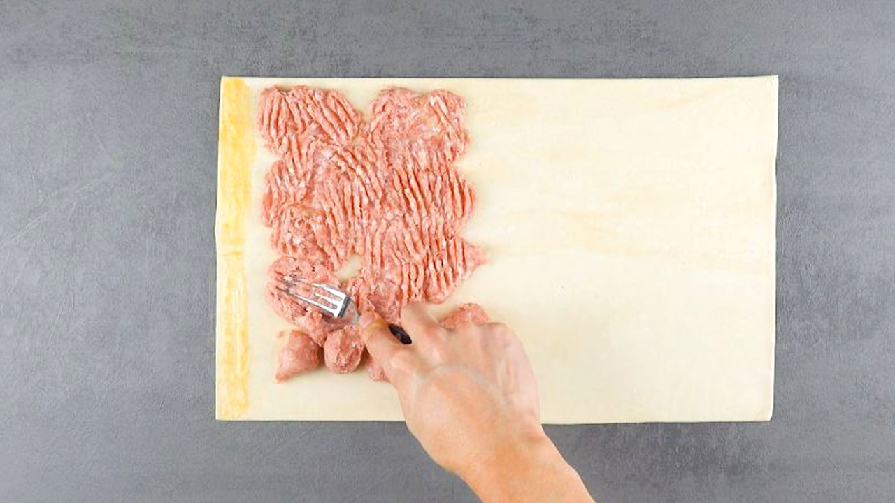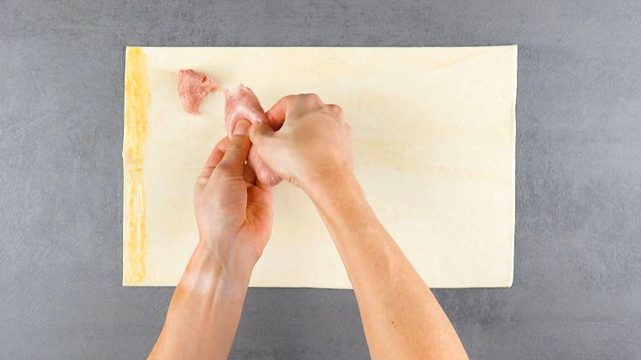 3.1 Breite den Blätterteig quer auf deiner Arbeitsfläche aus und bestreiche den linken Rand etwa 2 cm breit mit Eigelb. Schneide die 2 Salsicce auf und presse sie auf den Teig aus.