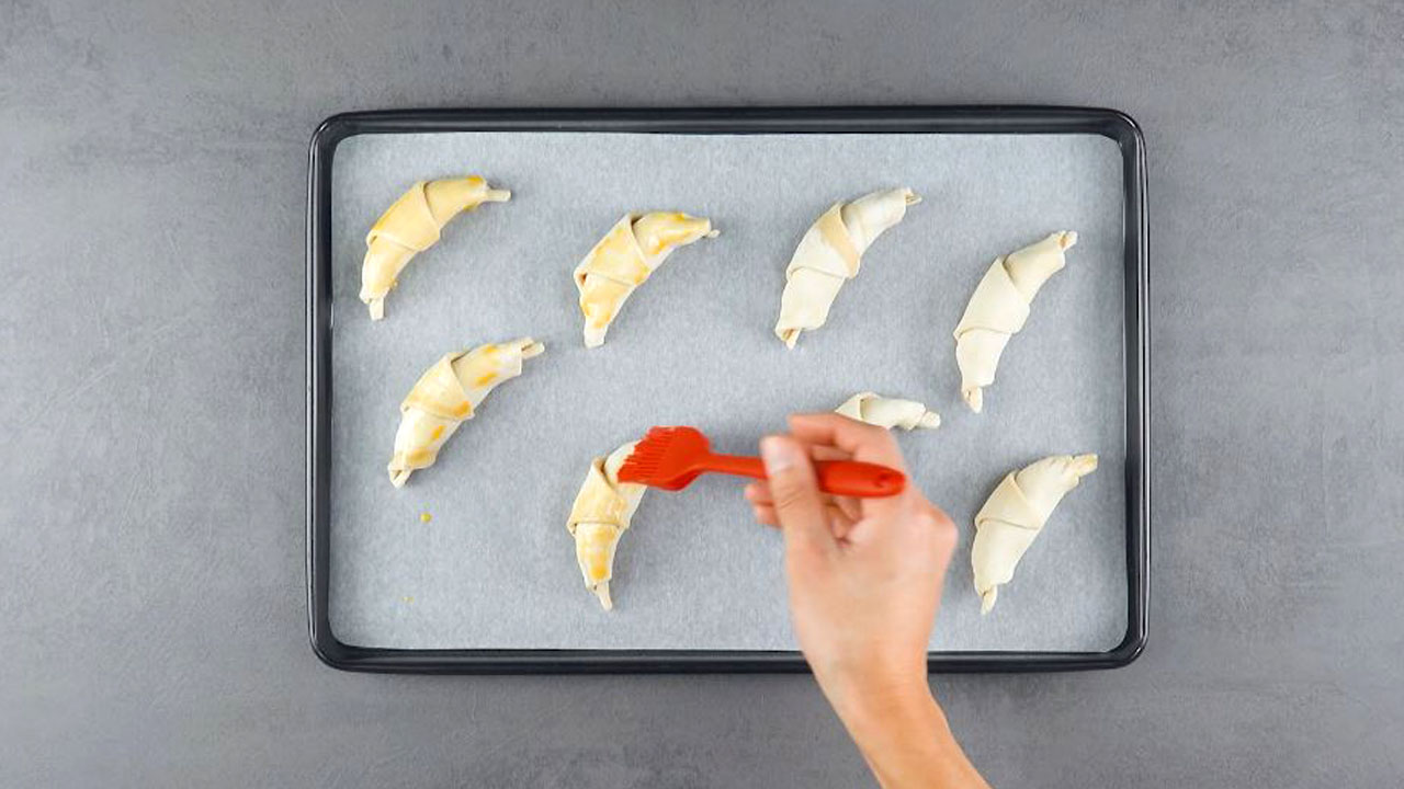 1.5 Lege die gefüllten Croissants mit ausreichend Abstand auf ein mit Backpapier ausgelegtes Backblech und bestreiche sie mit Ei.