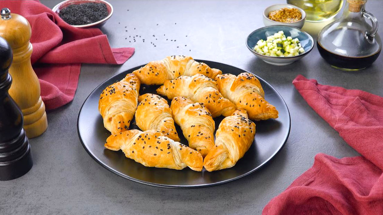 1.6 Streue abschließend den schwarzen Sesam über die Croissants und schiebe sie für ca. 20 Minuten bei 190 °C Ober-/Unterhitze in den Ofen. Saftig und lecker!