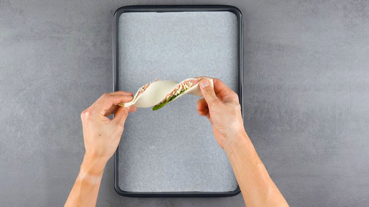 3.4 Klappe nun die rechte Hälfte des Blätterteigs nach links über die Wurst-Spinat-Füllung. Schneide den gefüllten Blätterteig danach mit einem Messer in 4 cm dicke Streifen.