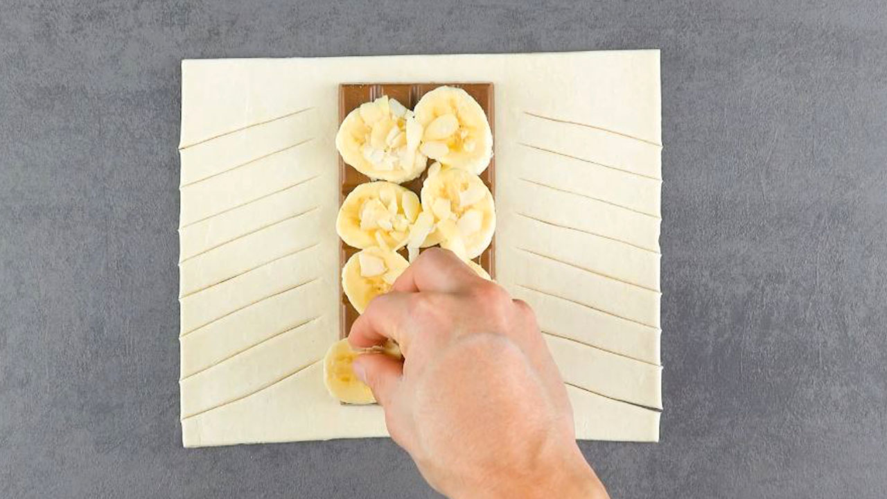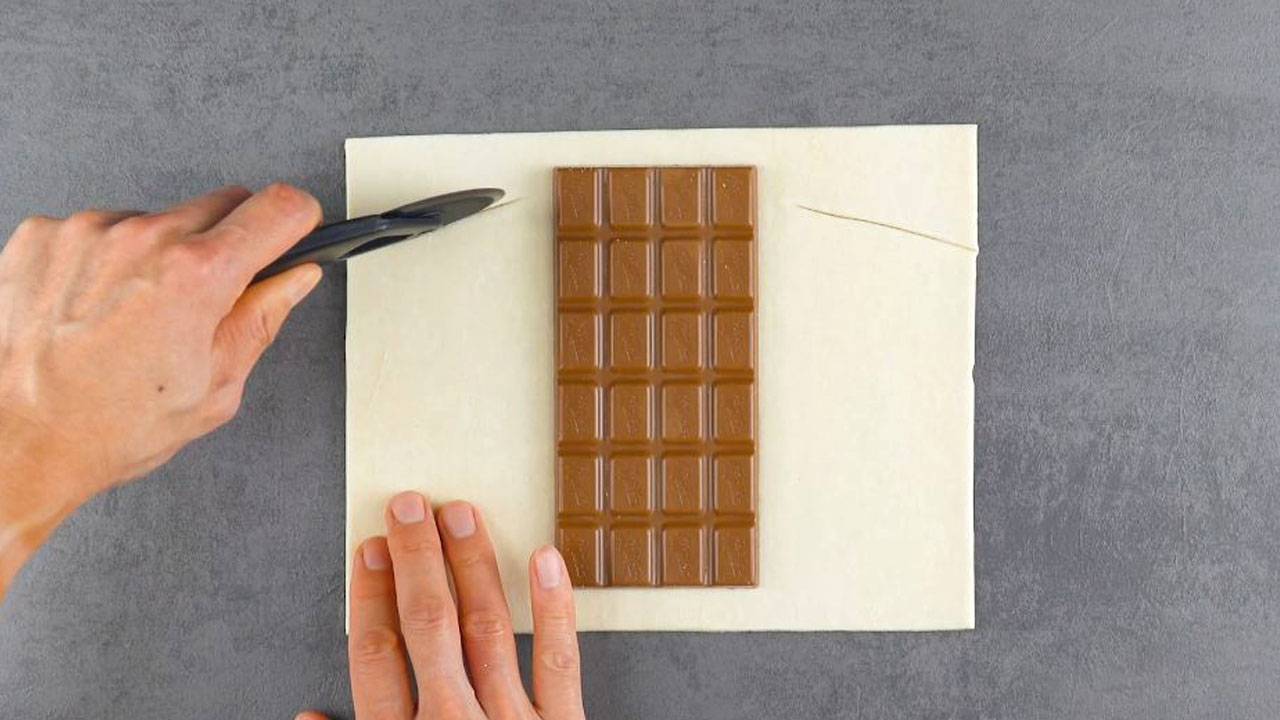4.1 Lege die Tafel Schokolade hochkant und mittig auf den ausgebreiteten Blätterteig. Schneide den Teig auf beiden Seiten der Schokolade etwa alle 1,5 cm schräg nach unten zum Rand hin ein.