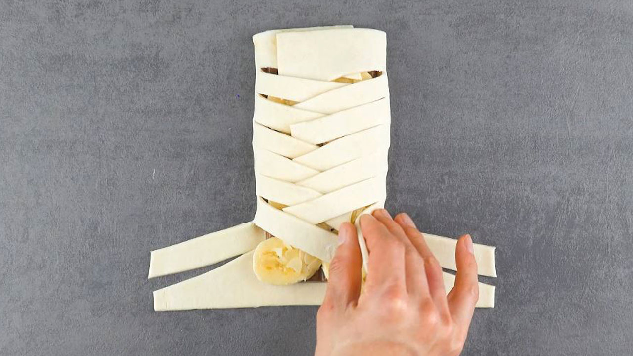 4.3 Flicht danach die Teigstreifen abwechselnd über die Schokoladen-Bananen-Füllung zu einem Blätterteigzopf.