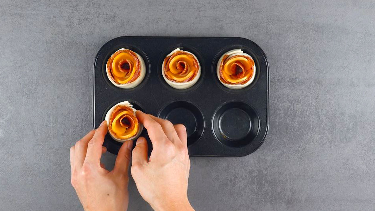 2.5 Rolle die einzelnen Streifen nun von links zu Rosenblüten auf und setze sie in die Vertiefungen einer Muffinform.