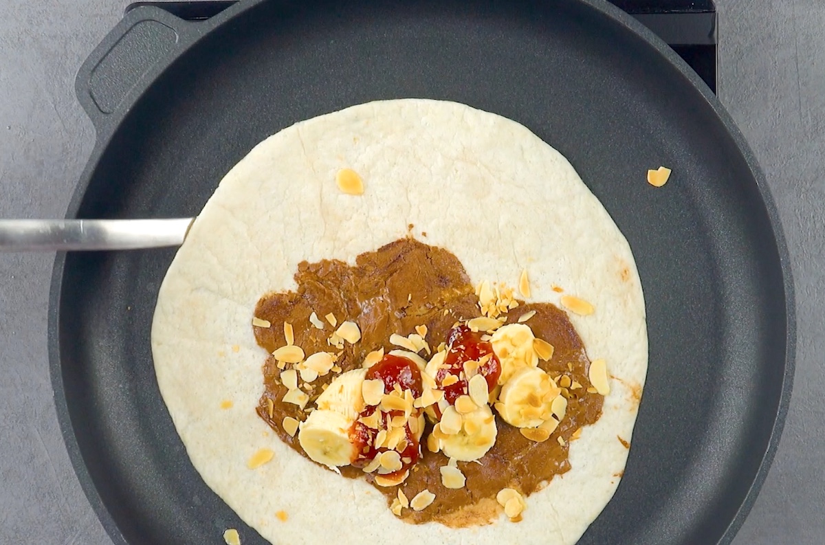 Bringe die Schokolade in einer vorgewärmten Pfanne zum Schmelzen. Lege dann die Tortilla darüber, drücke sie leicht an und drehe das Ganze um. Belege eine Hälfte der Tortilla nun mit Bananenscheiben, Erdbeermarmelade und gerösteten Mandelblättchen.