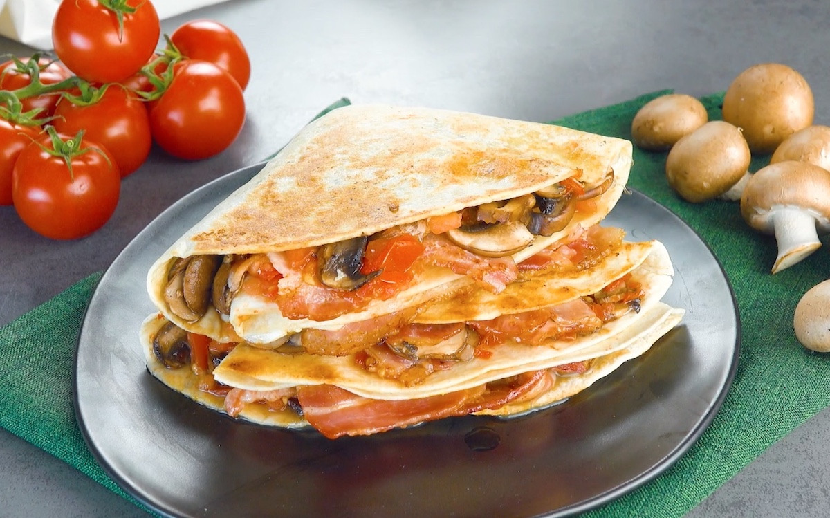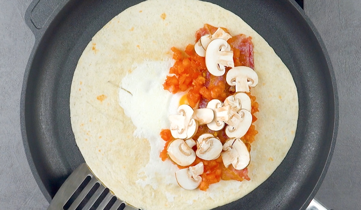 Gib das Ei in eine erhitzte Pfanne, lege die Tortilla darüber und brate beides zusammen an. Drehe die Tortilla um, sobald das Ei geronnen ist und daran haften bleibt. Belege eine Hälfte anschließend mit Bacon, Tomaten und Champignons.