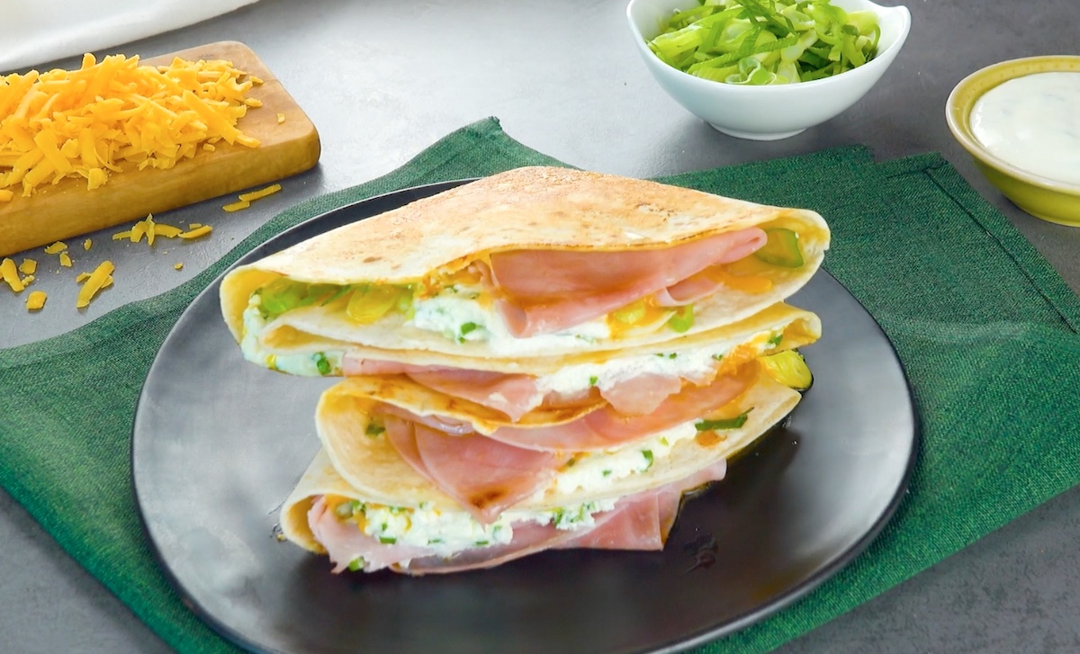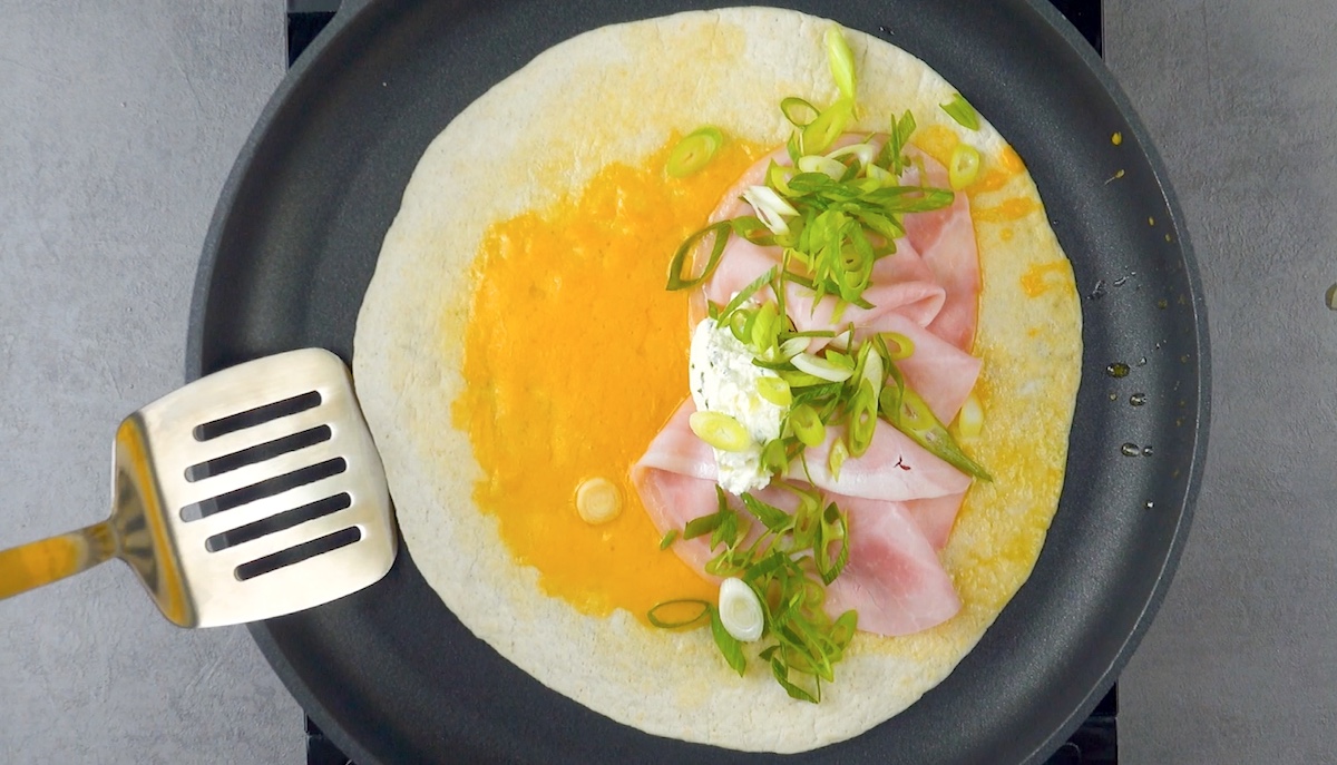 Erwärme die Pfanne und lass darin den Cheddar schmelzen. Lege dann die Tortilla darauf, drücke sie etwas an, sodass der Käse an ihr haften bleibt, und drehe das Ganze um. Belege nun eine Hälfte der Tortilla mit Schinken, Sour Creme und Frühlingslauch.