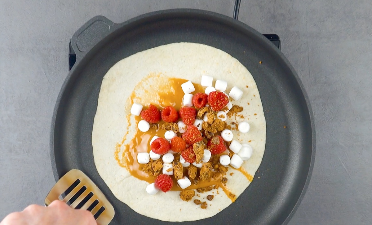 Bringe die Karamellbonbons in einer Pfanne zum Schmelzen. Lege dann die Tortilla darüber, drücke sie an und drehe sie anschließend um. Belege eine Hälfte dann mit Mini-Marshmallows, Himbeeren und Kekskrümeln.