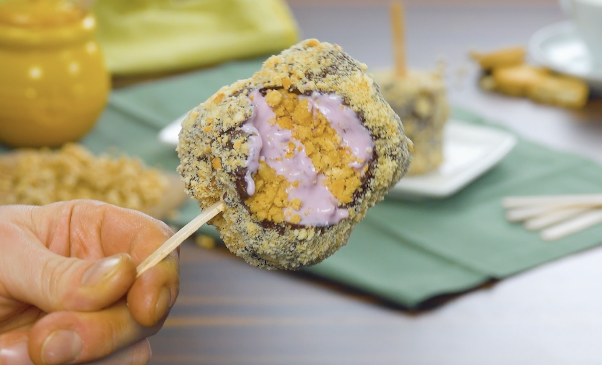 4.3 Löse das Eis aus dem Becher und tunke es in temperierte Schokolade. Wälze das Eis in weiteren Keksbröseln und lasse es vor dem Servieren 30 Minuten bei Zimmertemperatur oder 2 Stunden im Kühlschrank antauen.