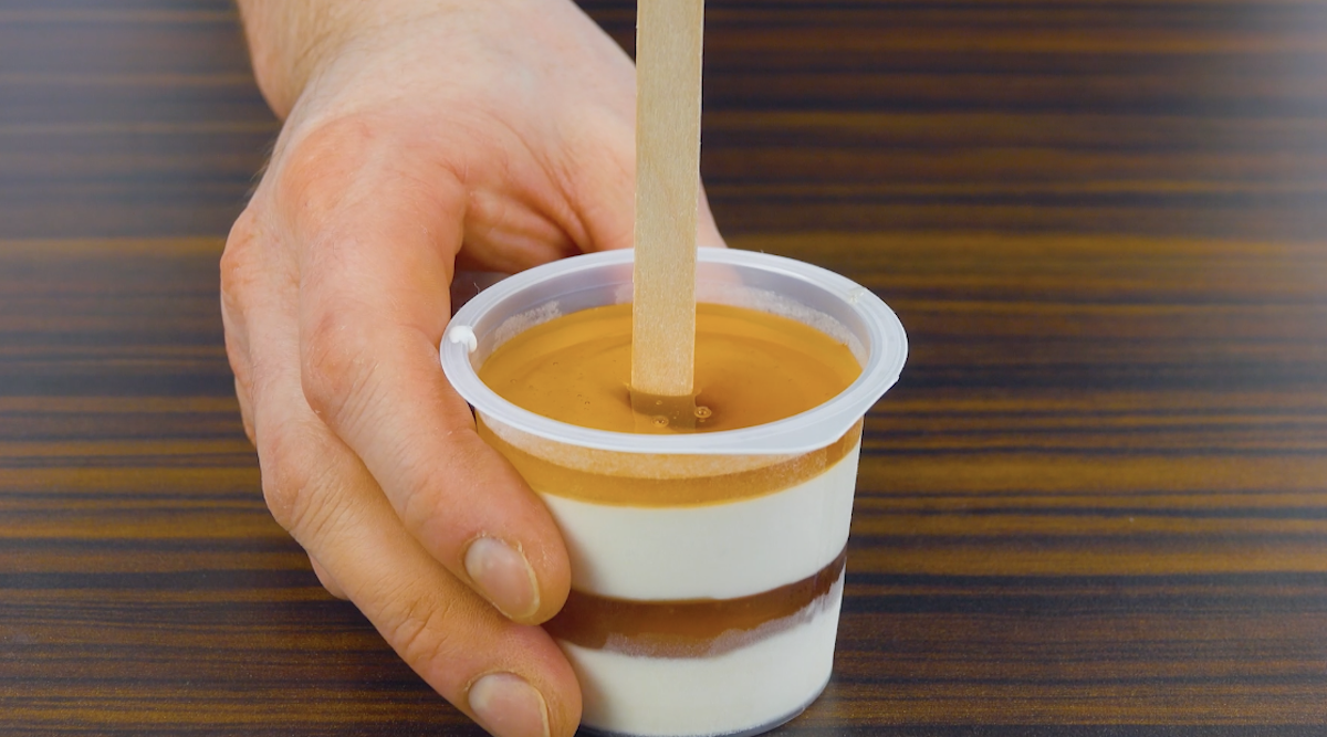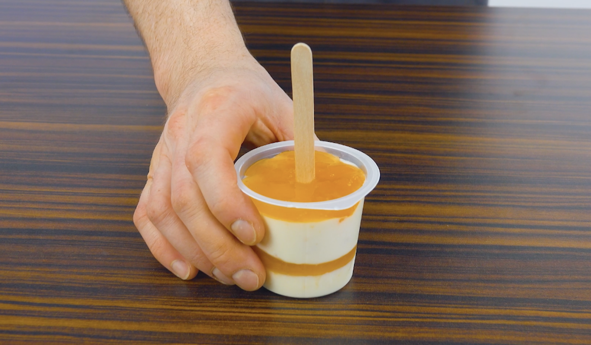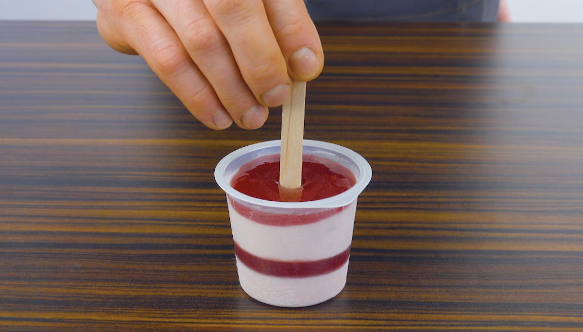 1.2 Stich einen Eisstiel in den Becher und stelle diesen für mindestens 6 Stunden, am besten aber über Nacht, ins Gefrierfach.