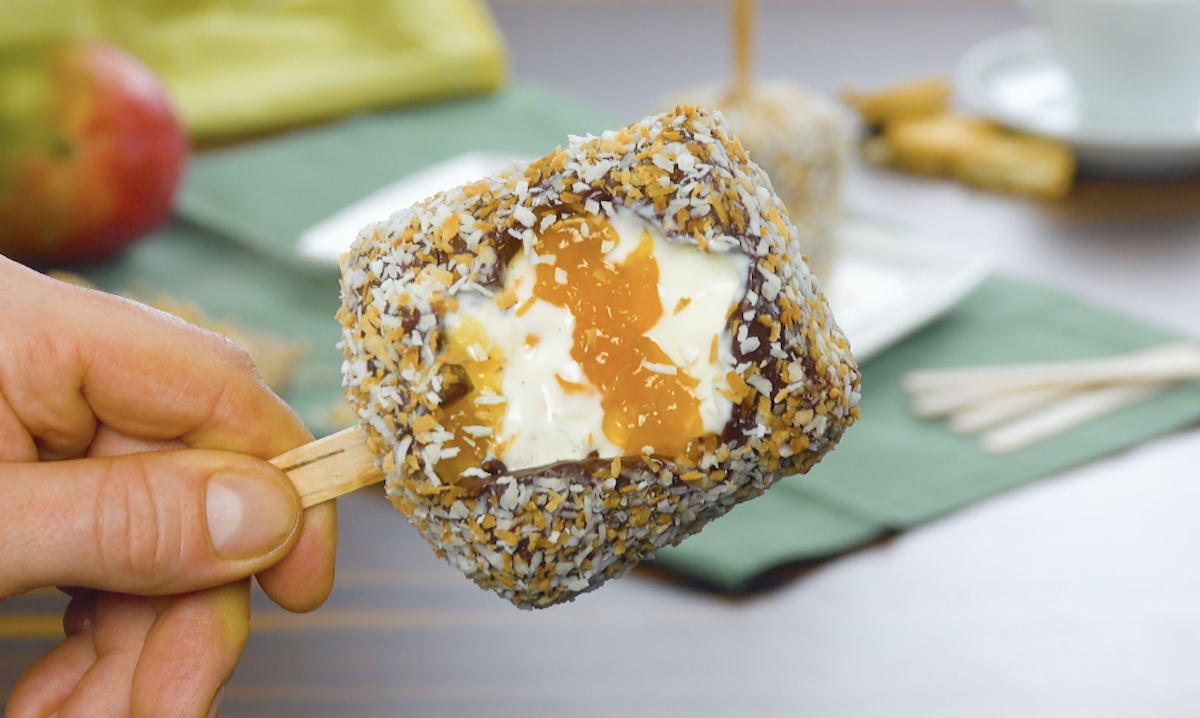 2.2 Löse das Eis mittels des Warmwassertricks aus dem Becher und tunke es in temperierte Kuvertüre. Wälze das Eis in Kokosraspeln und lasse es vor dem Servieren entweder 30 Minuten bei Zimmertemperatur oder für 2 Stunden im Kühlschrank antauen.