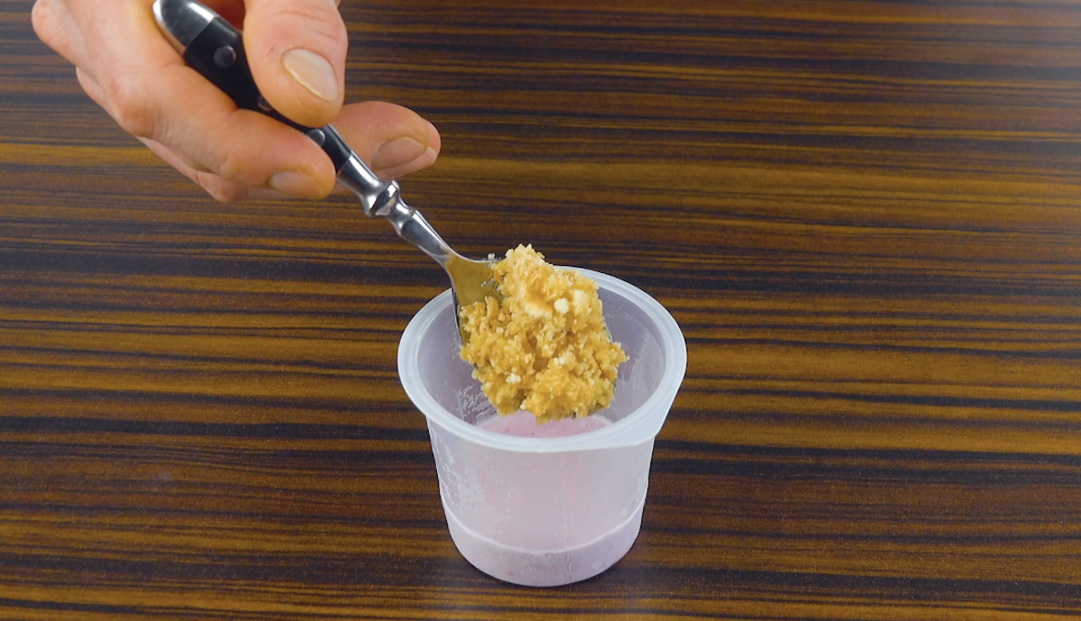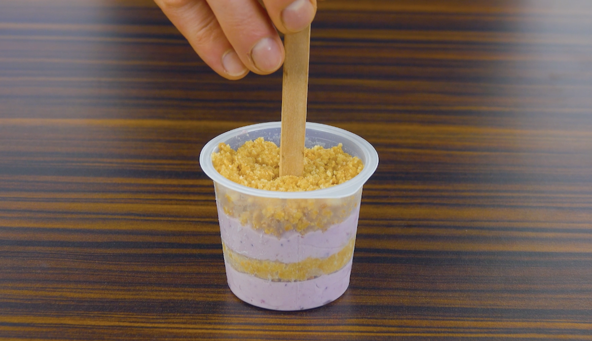 4.2 Gib 3 EL des beiseitegestellten Joghurts in den Becher und fülle diesen mit den restlichen Keks-Butter-Bröseln. Stecke einen Eisstiel in den Becher und stelle diesen für mindestens 6 Stunden, am besten aber über Nacht, ins Gefrierfach.