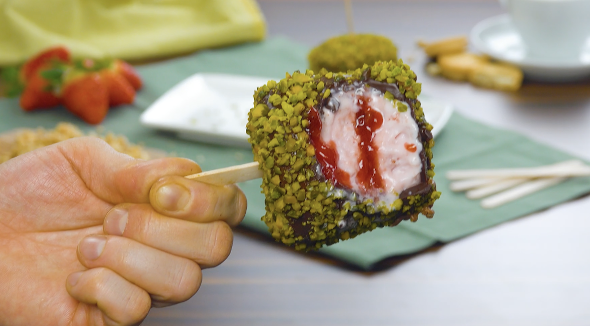 1.3 Löse das Eis aus dem Becher (am besten lässt du etwas warmes Wasser über den Becher fließen, dann geht es leichter). Tunke das Eis am Stiel in temperierte Kuvertüre und wälze es dann in gehackten Pistazien. Vor dem Servieren lässt du das Eis ca. 30 Minuten bei Zimmertemperatur (oder 2 Stunden im Kühlschrank) antauen.