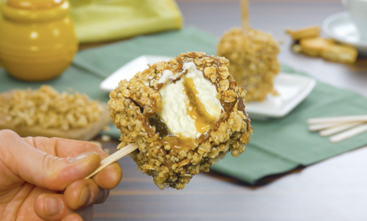 3.2 Löse das Eis aus dem Becher und tunke es in temperierte Schokolade. Wälze das Eis in Granola-Müsli und lasse es vor dem Servieren 30 Min bei Zimmertemperatur (oder 2 Stunden im Kühlschrank) antauen.